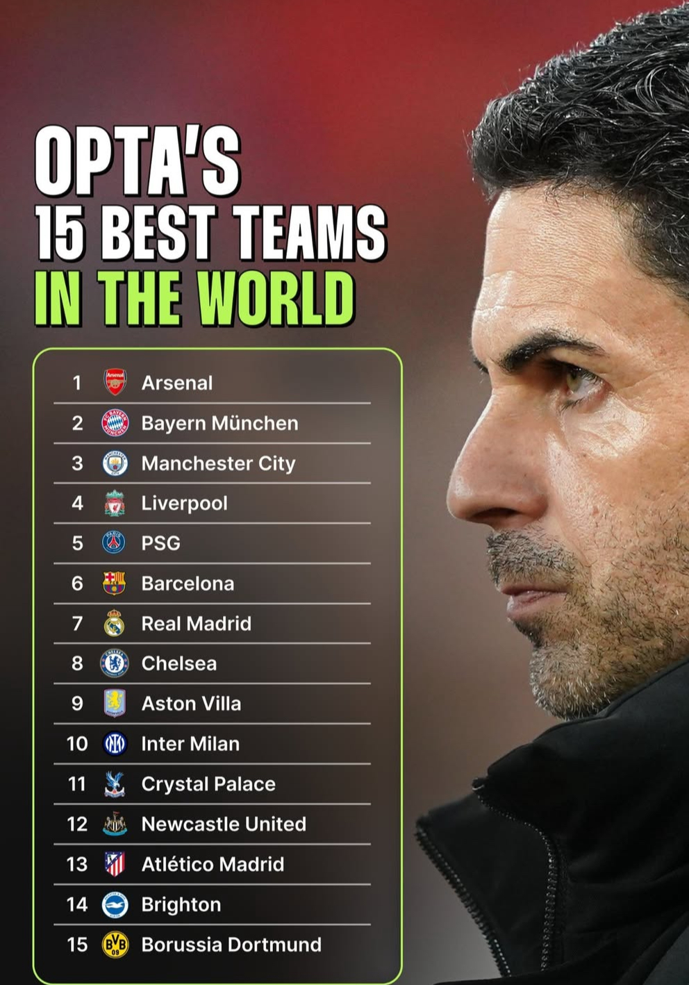 本赛季目前为止,OPTA给出的实时战力排行榜